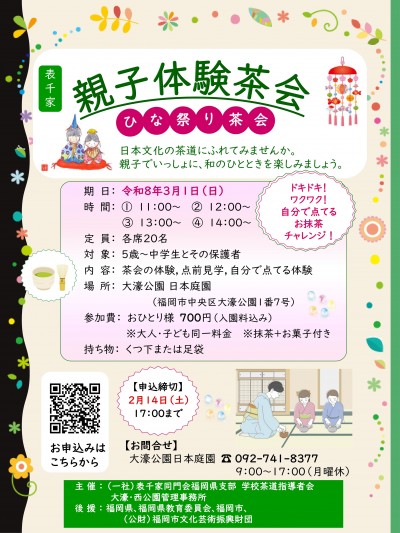 大濠公園日本庭園で「親子体験茶会~ひな祭り茶会~」を開催します。