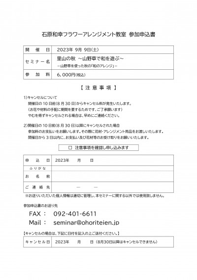 お申込みは、下記「ishihara-seminar202309」ボタンより資料をダウンロード頂き、「石原和幸フラワーアレンジメント教室 参加申込書」の内容確認と必要事項をご記入の上、FAXまたはメールにてお送りください。