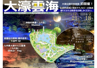 世界的庭園デザイナー石原和幸氏プロデュースによる、九州最大級の人工雲海と映像の融合による神秘的な世界が広がります。