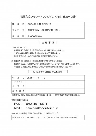 お申込みは、下記ボタンより資料をダウンロード頂き、「石原和幸フラワーアレンジメント教室 参加申込書」の内容確認と必要事項をご記入の上、FAXまたはメールにてお送りください。
