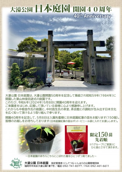 5月8日は日本庭園 開園40周年(先着150名様にもみじポット苗プレゼント)