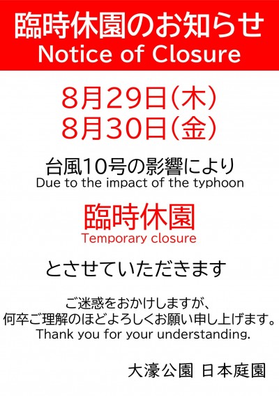 2024年08月27日8月29日、30日 臨時休園のお知らせ台風10号接近のため、以下のとおり臨時休園とさせていただきます。 8月29日(木) 終日 8月30日(金) 終日 ご不便をおかけし申し訳ありませんが、ご理解賜りますようよろしくお願いいたします。 8月31日(土)は通常どおり9時開園を予定しております。 【お問合せ】 大濠公園 日本庭園 電話:092-741-8377 大濠・西公園管理事務所 電話:092-741-2004