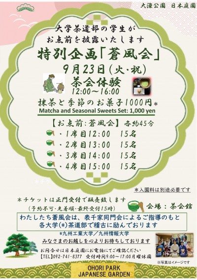 9月23日(火・祝)に大学茶道部による茶会体験を開催いたします