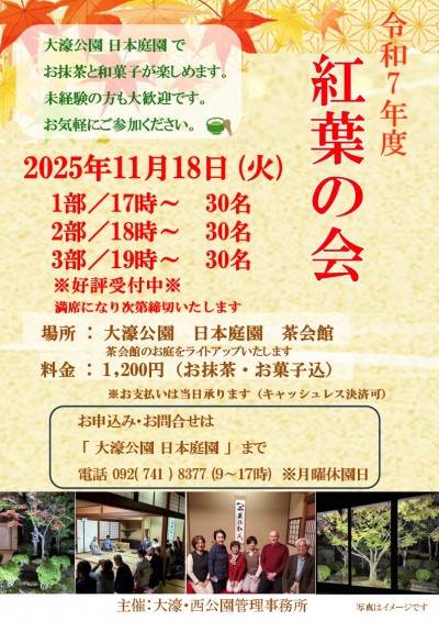 参加人数が変動しておりますので、最新情報は日本庭園(092-741-8377)までお問い合わせください。